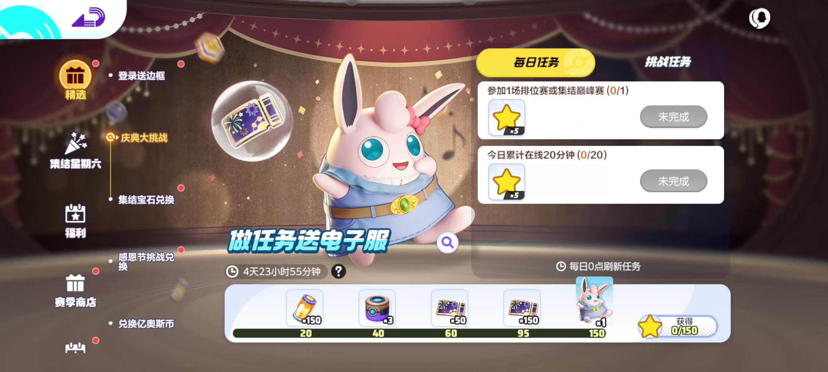 完成每日任务和挑战任务即可获取星星,获取星星可以兑换电子服奖励。