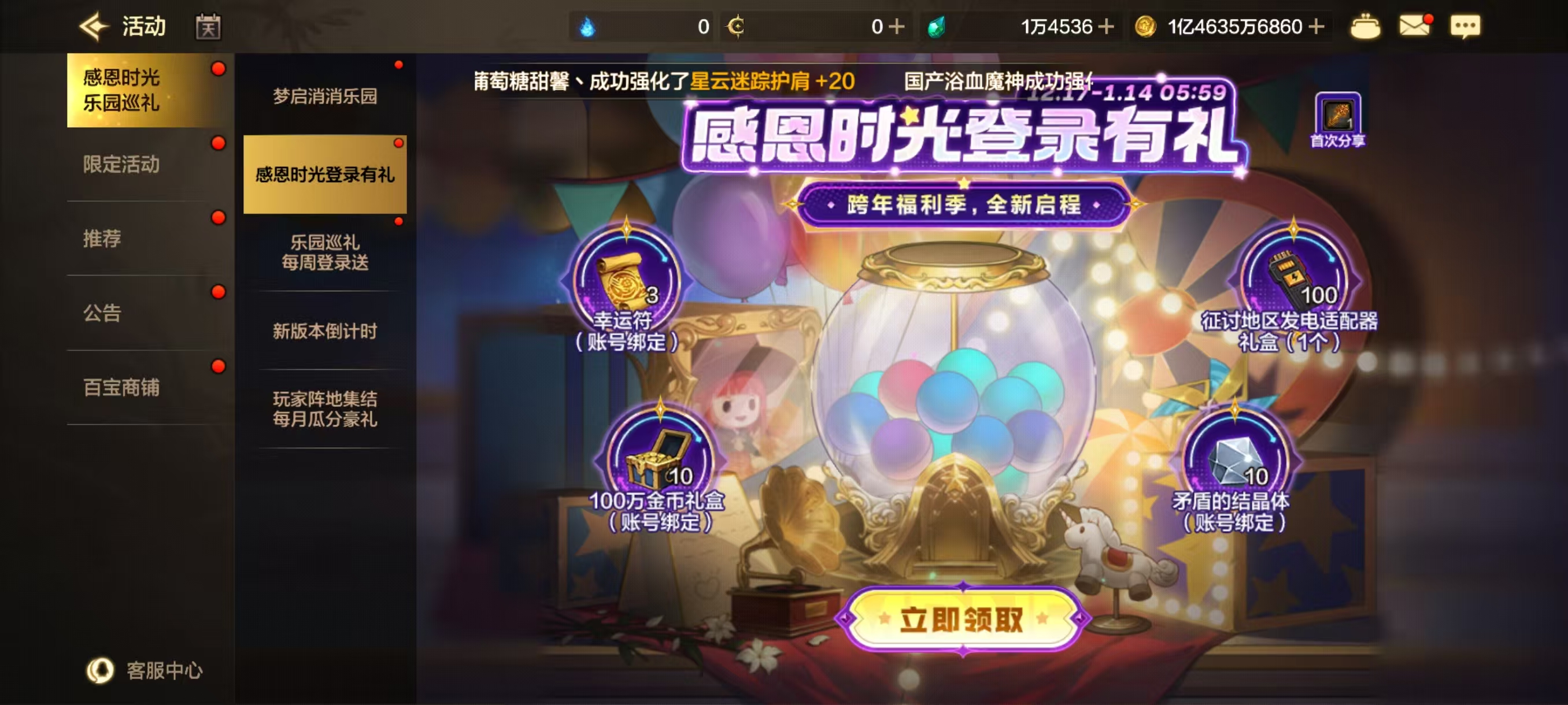 活动期间登录即可领取幸运符(账号绑定)*3、矛盾的结晶体(账号绑定)*10、征讨地区发电适配器礼盒(1个)*100、100万金币礼盒(账号绑定)*10奖励。首次分享还可获得夺宝之钥(限时)*1。