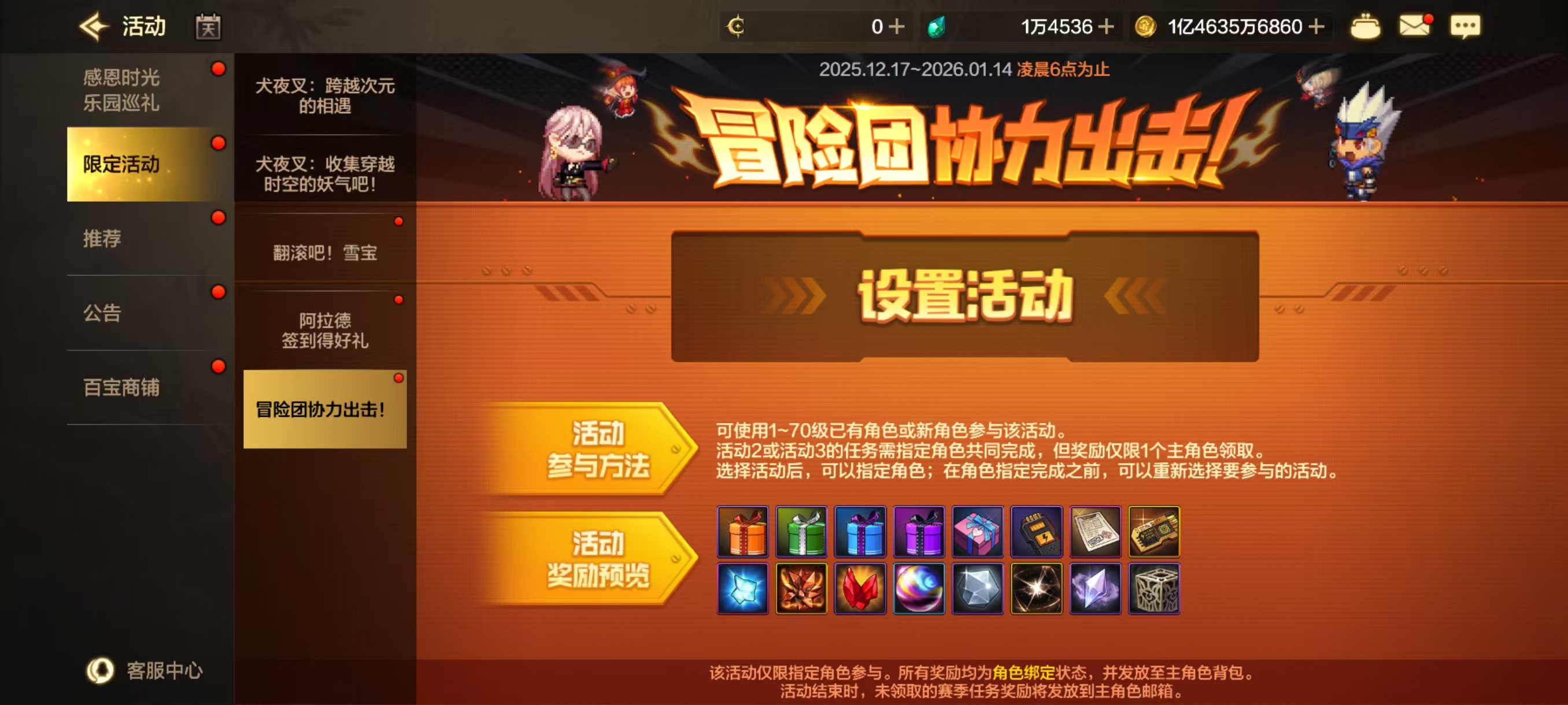 指定角色参与活动,完成任务得丰厚养成奖励。