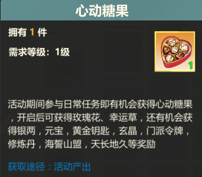 满载幸福爱相伴, 甜蜜启程情意长。活动期间内,参与日常活动可获得【心动糖果】,开启必得【玫瑰花】和【幸运草】,并有机会获得高级玄晶、门派令牌等奖励。