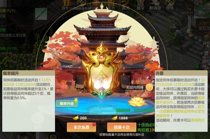 活动期间内,招募极品同伴的概率将会提升。同时选择想要的极品同伴进行许愿,指定极品同伴的获得概率将会大幅度提升,活动期间每位大侠共有2次许愿机会。请各位大侠不要错过。