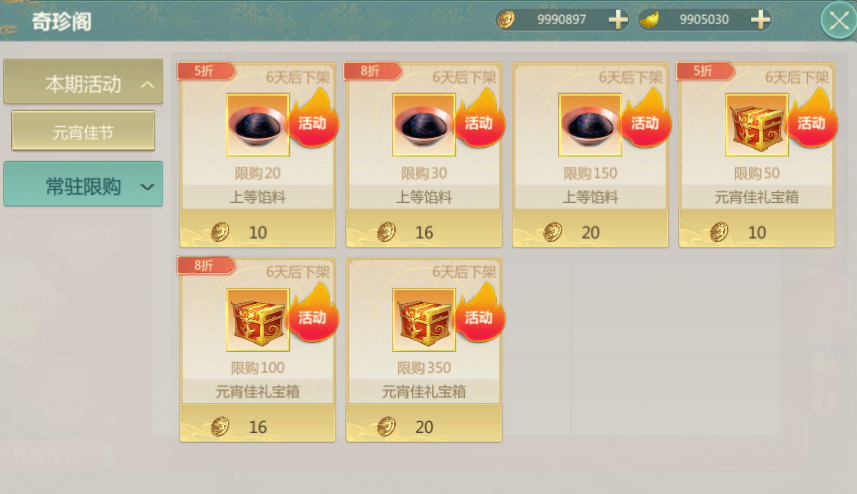 桂花香馅裹胡桃,江米如珠井水淘。活动期间内,参与日常活动可获得元宵材料袋,开启元宵材料袋可随机开出面团或山泉水,用以制作面汤上交获得奖励,也可与奇珍阁限购商店购买的上等馅料一起制作美味元宵,前往临安城交给元宵使者即可有机会获得宝石初级箱、高级玄晶、五行魂石、门派令牌、元宝等丰厚奖励。