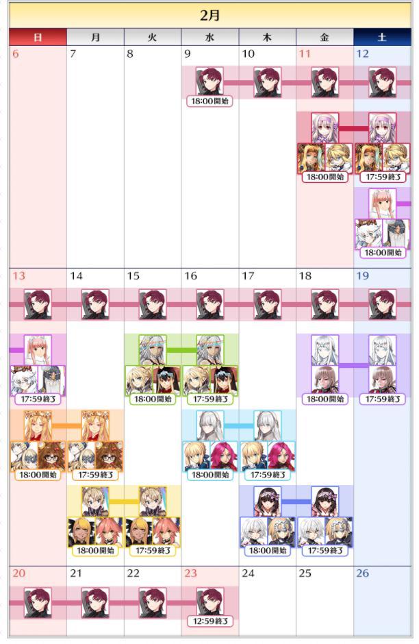 这里简单介绍一下这个UP表是怎么看的,巴姐是全程UP,然后表头是月份、星期和日期,从2月11日开始常驻从者的日替,每个日替大概从当天下午5点到隔天下午5点,一次会开启2~3个从者的日替卡池,例如2月11日,卡池内就同时有4个从者的单UP限定卡池,而到了12日下午5点,卡池会交接替换。