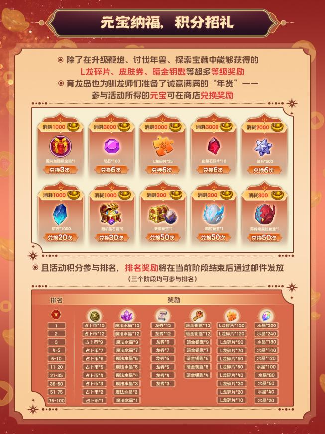 参与活动不仅能够获得丰富的等级奖励,元宝也能够在商店兑换奖励,表现优异的驯龙师还能够获得排名奖励!