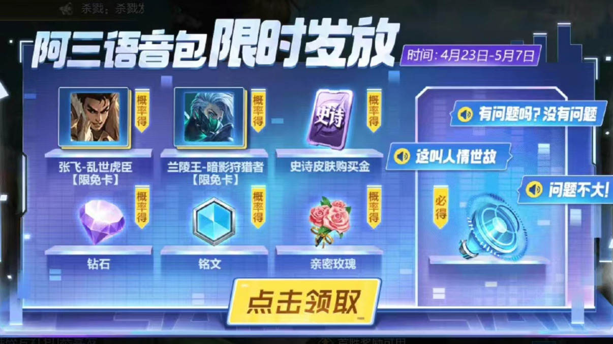最后就是王者荣耀又新出了一个活动,这个活动可以获得限时语音,然后还有概率获得永久史诗皮肤卡,具体是怎么回事,咱们一起来看下。