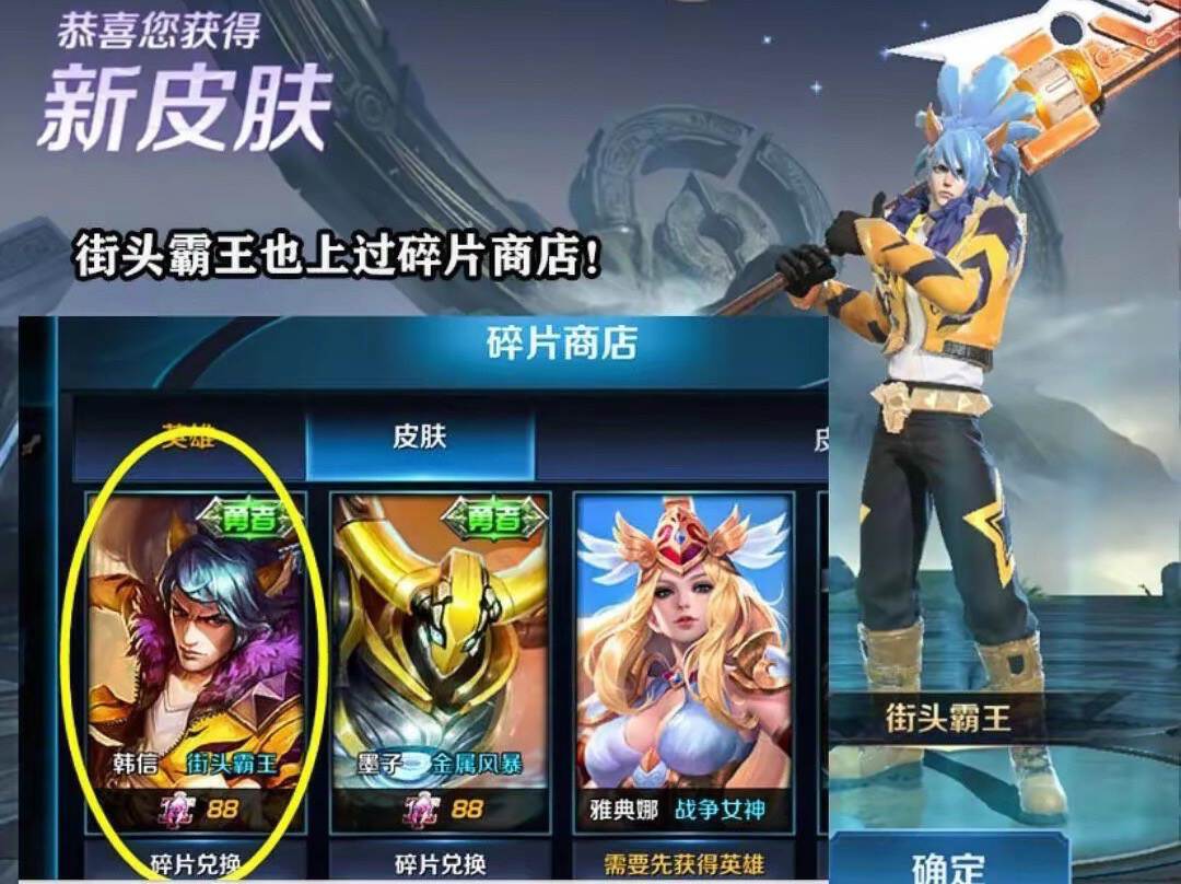 其实在很早之前,皮肤碎片商城的皮肤数量比现在要多,老玩家应该都还记得,韩信的街头霸王这款在当初是上线过皮肤碎片商城的。在很早之前,街头霸王这款皮肤才上线没多久,王者官方曾经把这款皮肤放入过皮肤碎片商城,用78个皮肤碎片就可以兑换。