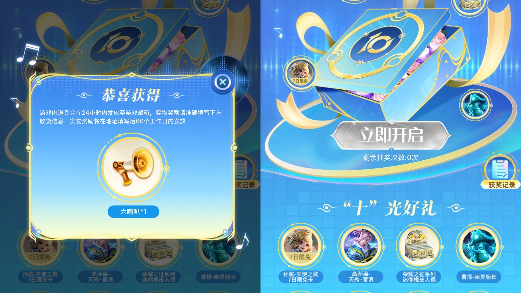 抽奖有概率抽到永久皮肤,比如高渐离的天秀音浪,还有曹操的幽灵船长等等。