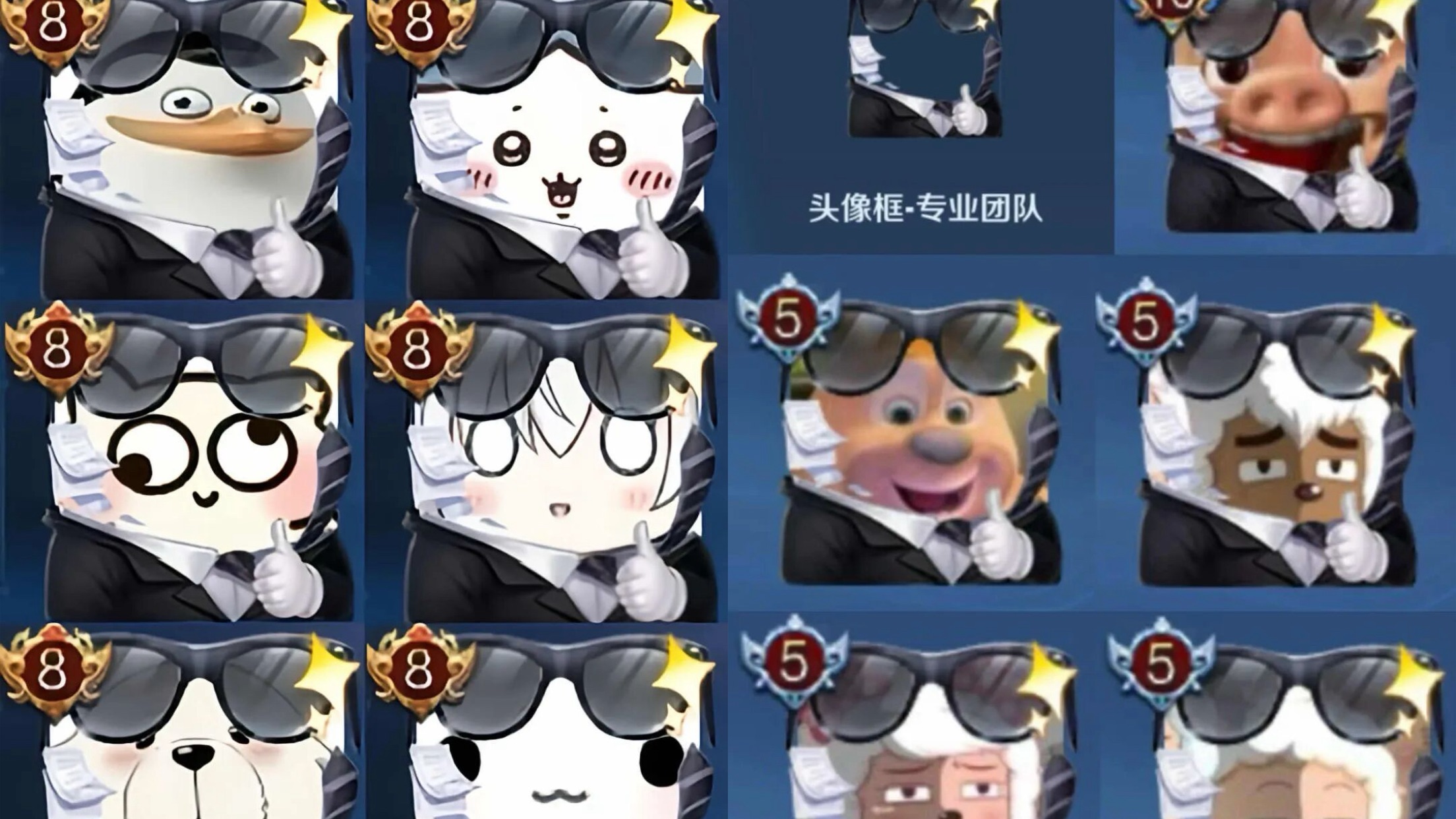虽然效果没有三星堆头像框那么奇葩,但是胜在免费。而且这款头像框的优点不仅仅是有墨镜,还有配套的西装,再加上白手套点赞的手势,搭配一些头像效果也非常好。