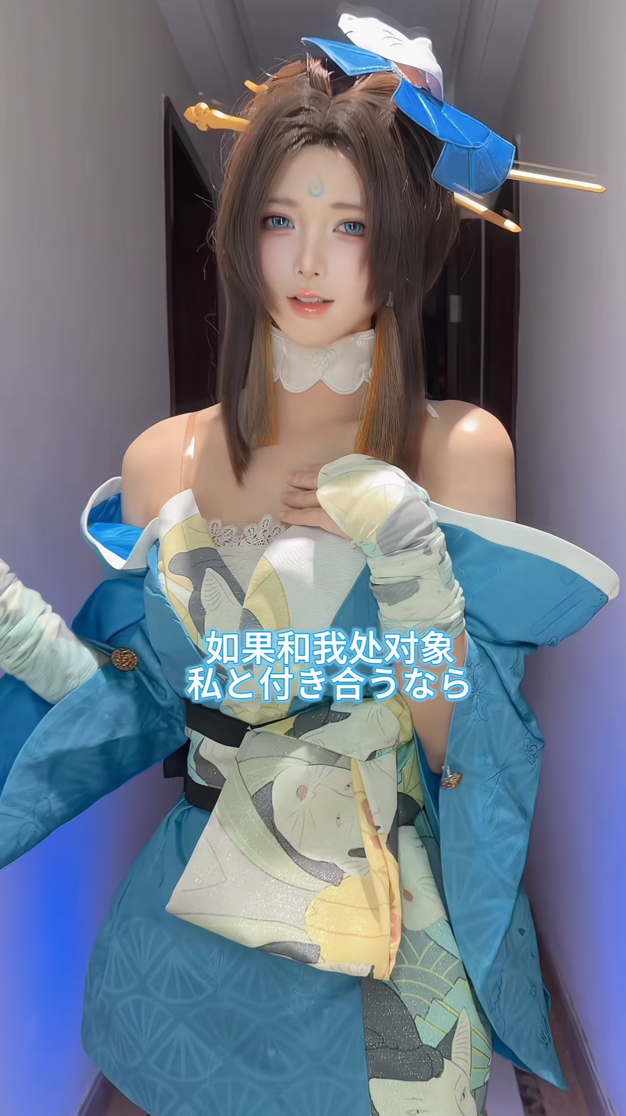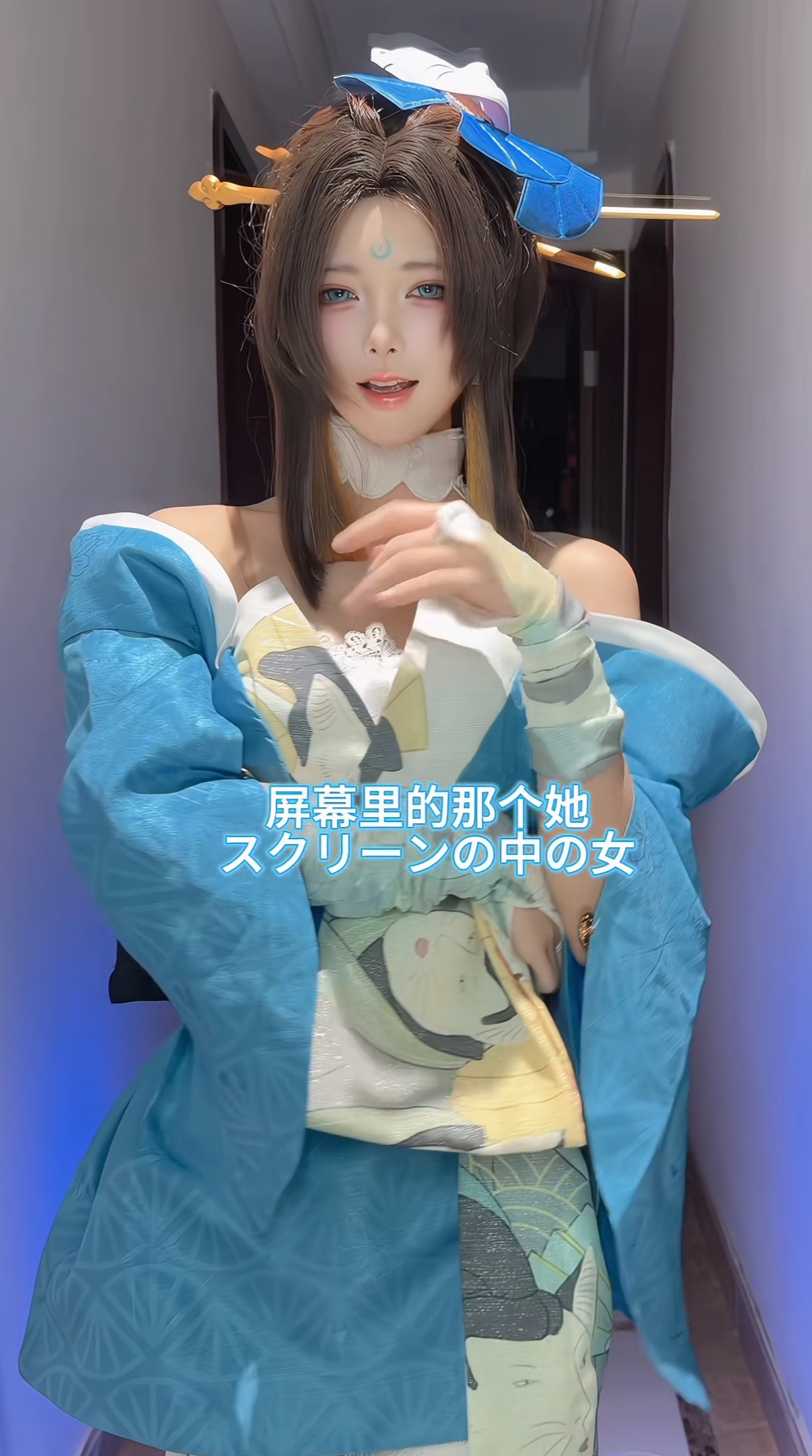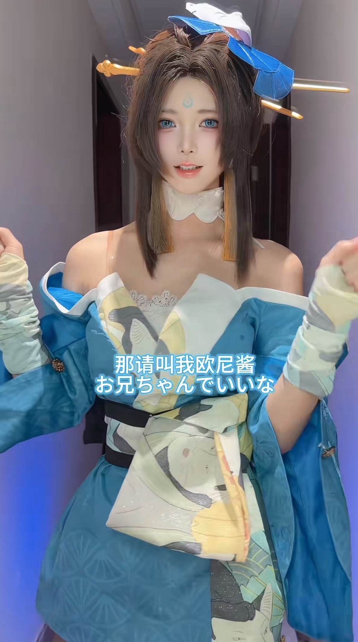而且在妆容方面,这位博主也下了很大的功夫,眉心的蓝色印记还原不说,博主还特意带了蓝色美瞳,只为还原出游戏中的效果。