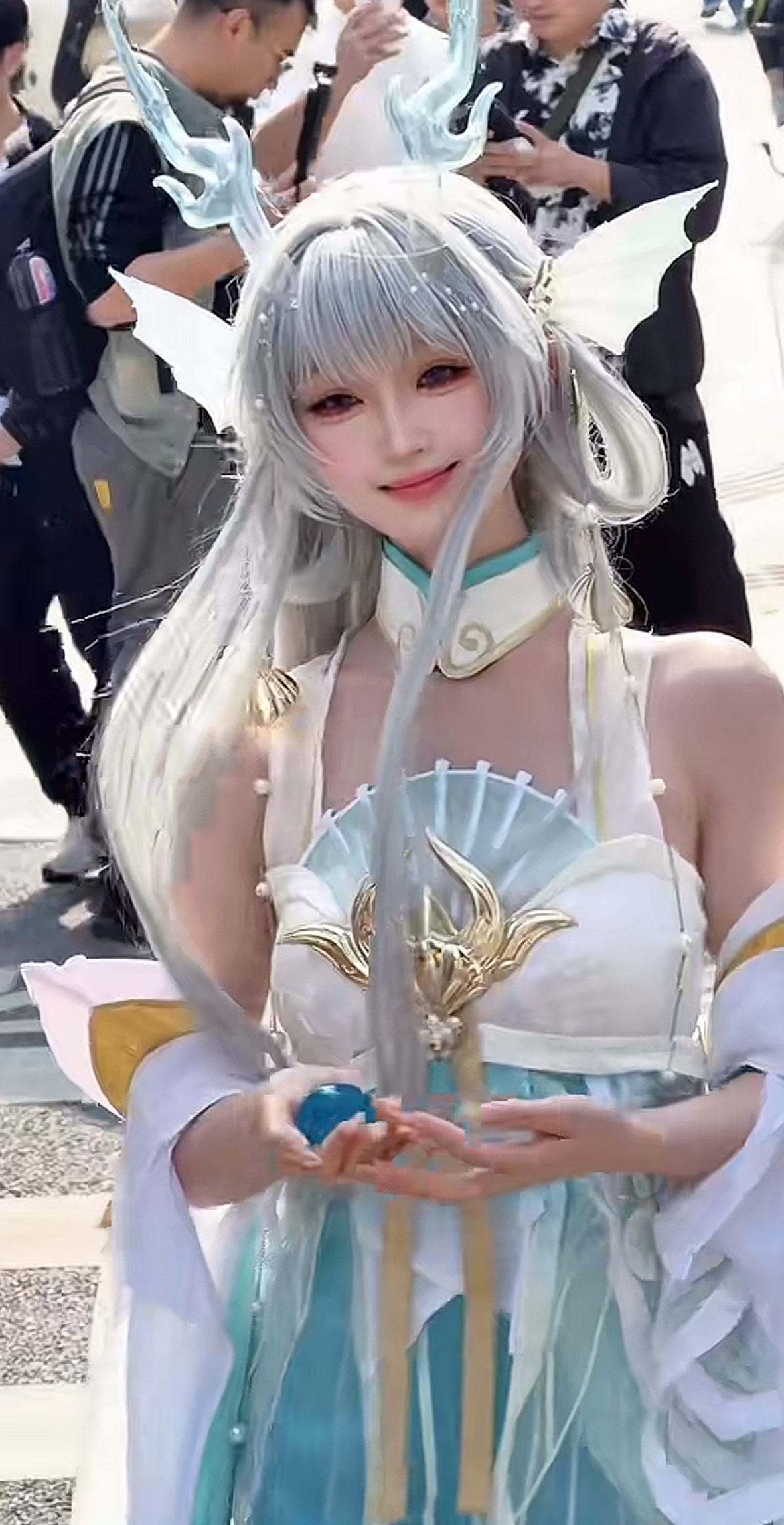 是西施这款皮肤的标配,能看到付慧琳手中拿着一颗蓝色的龙珠,圆圆的,和她的这个造型也是比较搭配的,加上贝壳的头饰还有龙角,这个造型也比较仙气,玩家们很爱!