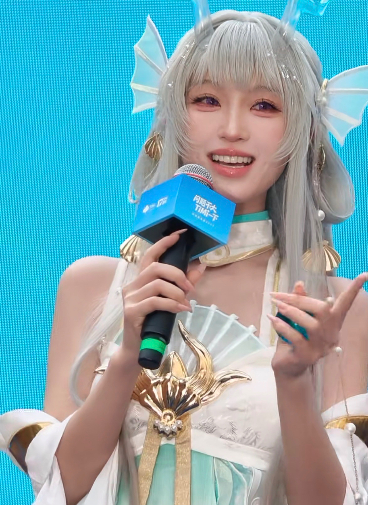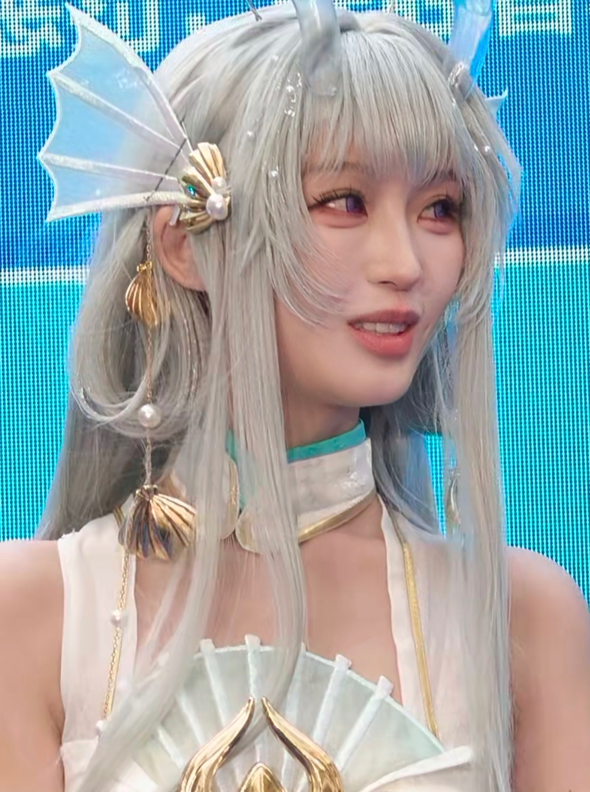能看到付慧琳身穿一身蓝白色的衣裙,头上戴着一顶白色的假发,假发上面还戴了一对贝壳样式的头饰,头上还有一对透明的龙角,看着很可爱。