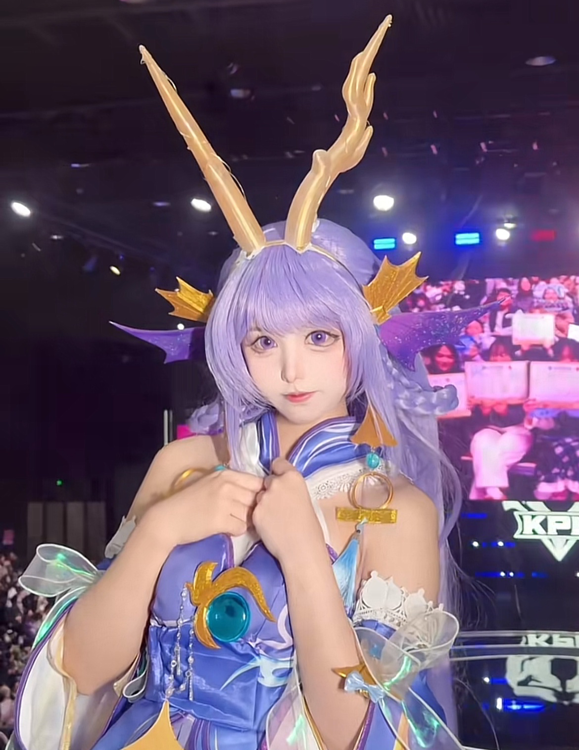 能看到网红喵喵大王就曾经cos了西施的这款赛事战令星元皮肤,能看到她身穿一身紫色的衣裙,头上也是戴着一头紫色的假发,发型相对来说比较长,而且下面还绑了一个大大的麻花辫,再加上平刘海,还有头上戴的金色的一对龙角,旁边甚至还有金色的鱼鳞装饰。看起来很还原。