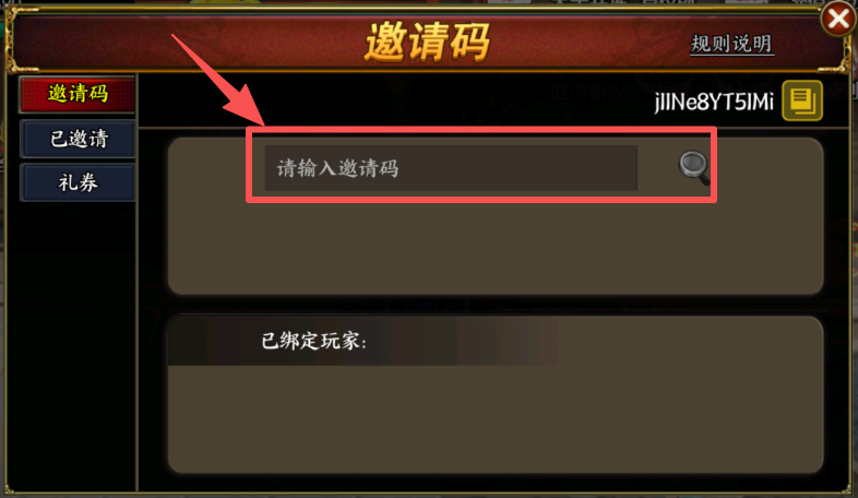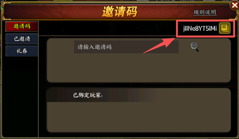 玩家可以邀请任意用户填写自己的邀请码进行绑定,绑定成功后,邀请玩家可获得被邀请玩家在绑定期间一定真实充值比例的礼券奖励。