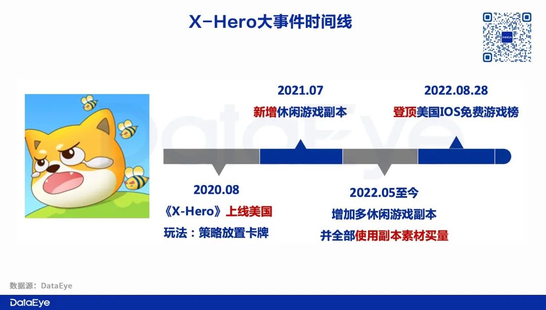 2021年7月,《X-Hero》开始增加爆款休闲小游戏作为副本内容,但这一摸索持续了近一年。在确认这样做有一定的引流效果后,2022年5月,《X-Hero》开始频繁更新休闲小游戏副本,同时利用休闲小游戏产出大量买量素材以吸引休闲玩家进入游戏。