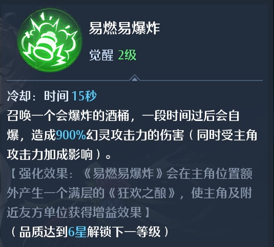 建议不管敌人在哪,优先使用特技一【宴请四方】为自己积累两层狂欢效果,再快速使用特技二【狂欢之酿】为友方提供援助,觉醒技【易燃易爆炸】在进入激怒阶段和友方一起四连觉醒破防即可。