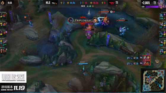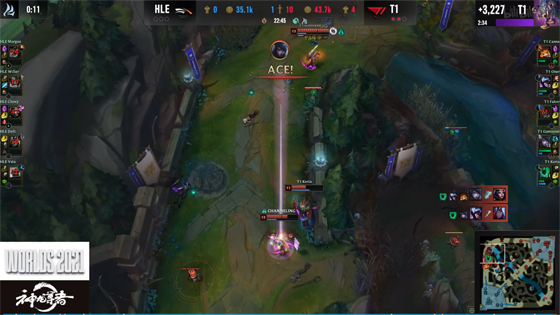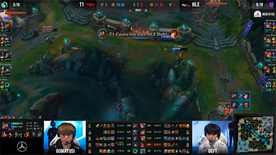 本场前期HLE上、中尤其是Chovy的补刀如愿压制了Faker,可是HLE的团战表现和T1相去甚远:第一只峡谷先锋团战Morgan的鳄鱼在侧翼进场很晚,导致HLE正面被打散,丽桑卓拿到双杀;第二只先锋团战Willer的赵信进场瞬间被融化,Oner的波比也拿到了双杀,而Chovy的妖姬被T1中野血克,比上一局更难发挥。中期T1付出上、中的代价rush掉大龙,拆完了HLE的全部外塔,Morgan再现红怒W打真眼的“名场面”。HLE在第二条大龙出生后放手一搏,Gumayusi的厄斐琉斯斩获三杀,T1打出0换5团灭HLE,以碾压之姿一波结束比赛!