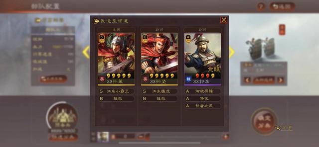 这一套基本没难度只要冲到100基本上都能组成,也比较实用前期开开荒,种种地,补补刀也都有用,主要我这个郭淮纯辅助,带上净化和长者之风实力也有大幅增强而且孙策的江东小霸王也有奶打个地不死人也是有可能的,作为萌新我其实听推荐的起码前期不会因为撞地没有游戏体验,后期培养一个主力也能打一打6,7级地,最主要不是氪金
