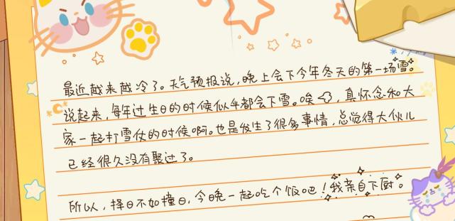 并且为了突出琪亚娜大大咧咧的性格,信件也出现了和类似希儿、黑希的彩蛋。比如在信件的字体上琪亚娜的就不像其他人那么工整,反而和"小学生"一般,不仅字体看起来歪歪倒倒,同时还在信中用画出了诸如雪花、火锅、煎饺、樱桃派、奶酪等食物,颇有小时候写日记的风格。