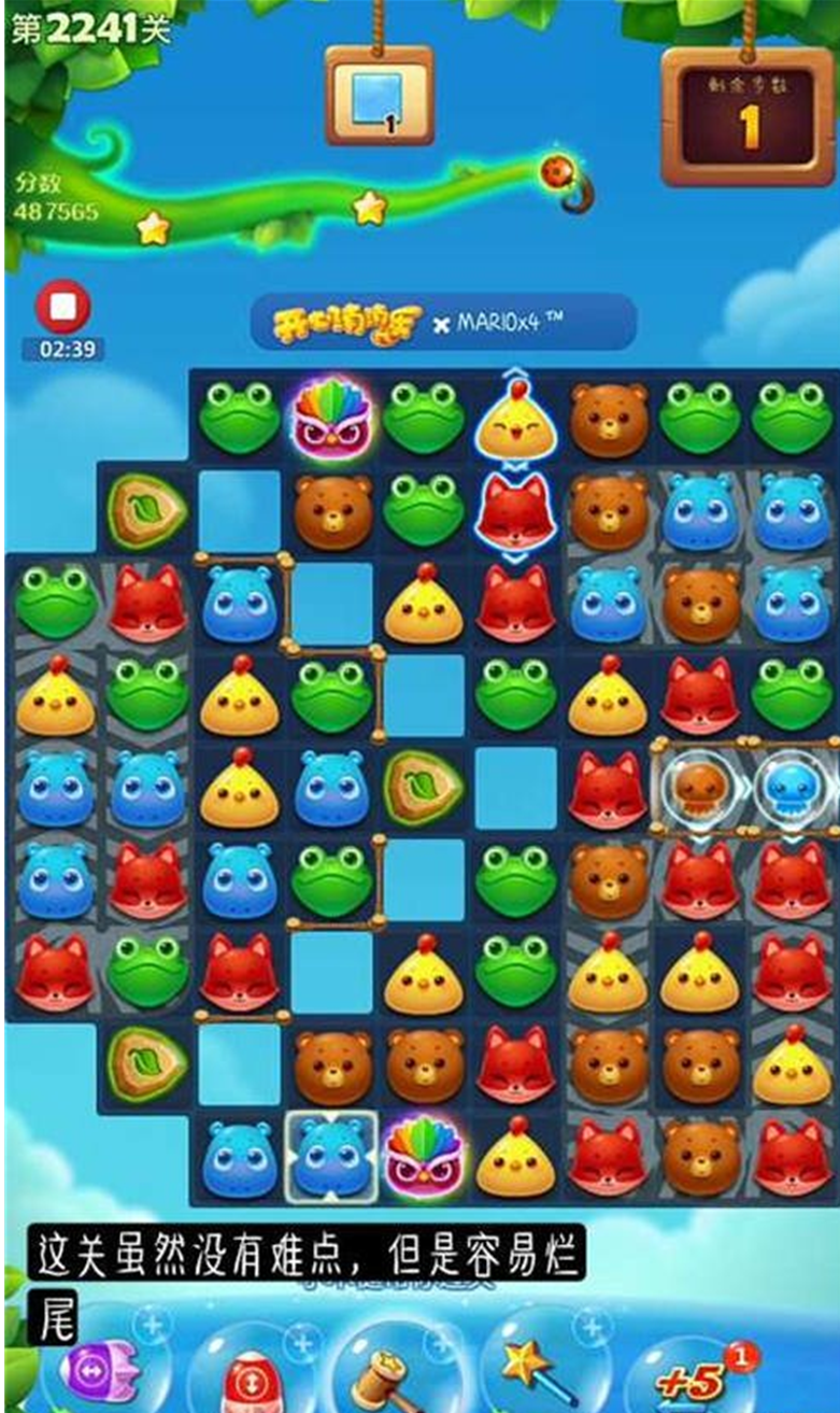交换两个特效。消除激活左侧魔法石以后带动消除毛球。一对星星瓶子激活以后交换,右侧下落动物。下方往左侧消除雪块为主,难点就是中下方雪块。如果没有消除就触发水母特效连消来带动。水母也没有消除的话就去消除魔法石来带动。
