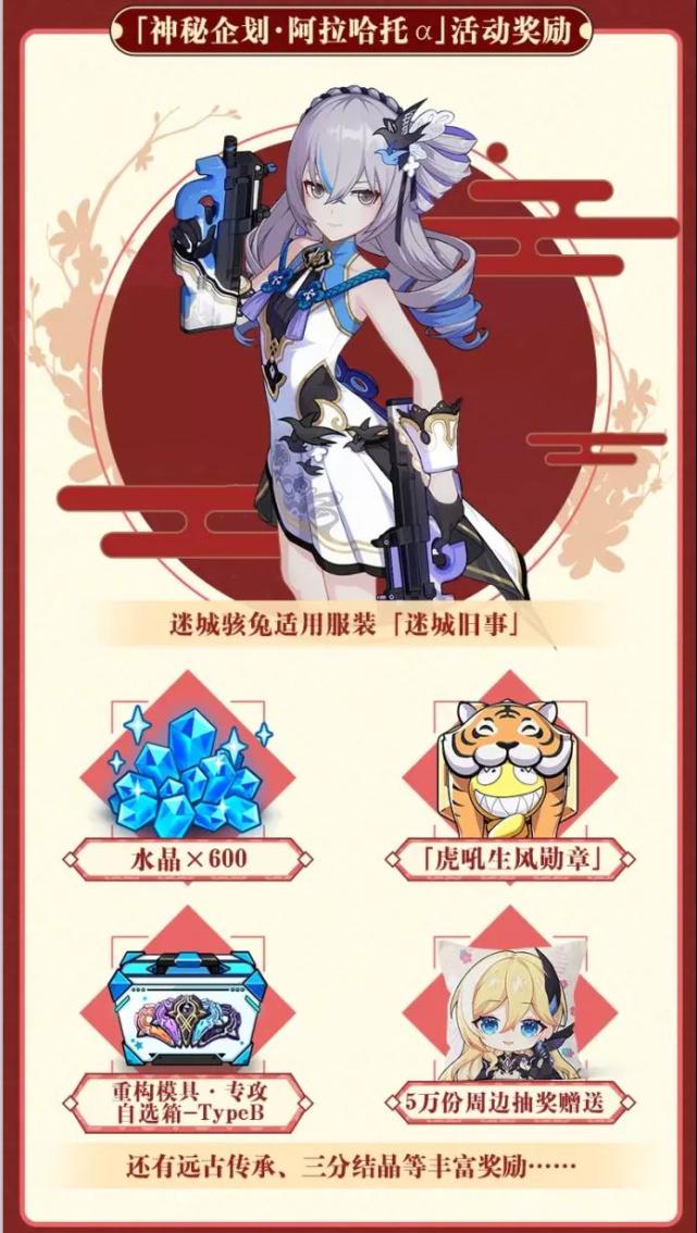 春节特别活动【神秘企划·阿拉哈托α】:参与活动可获取迷城骇兔新服装——迷城旧事,以及水晶等奖励。