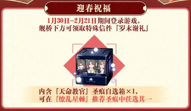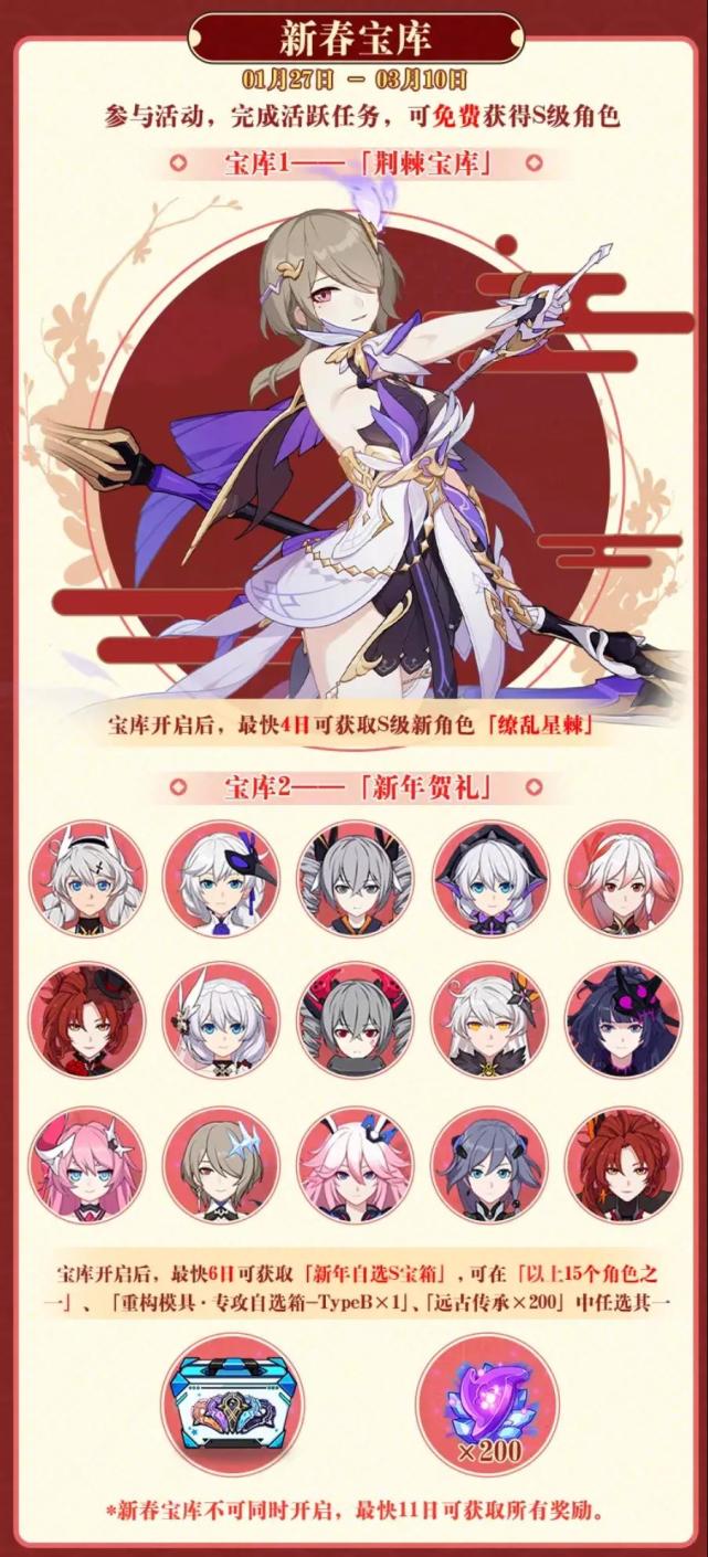 新春宝库:完成活动任务可领取缭乱星棘角色卡外加S级女武神自选宝箱一个。