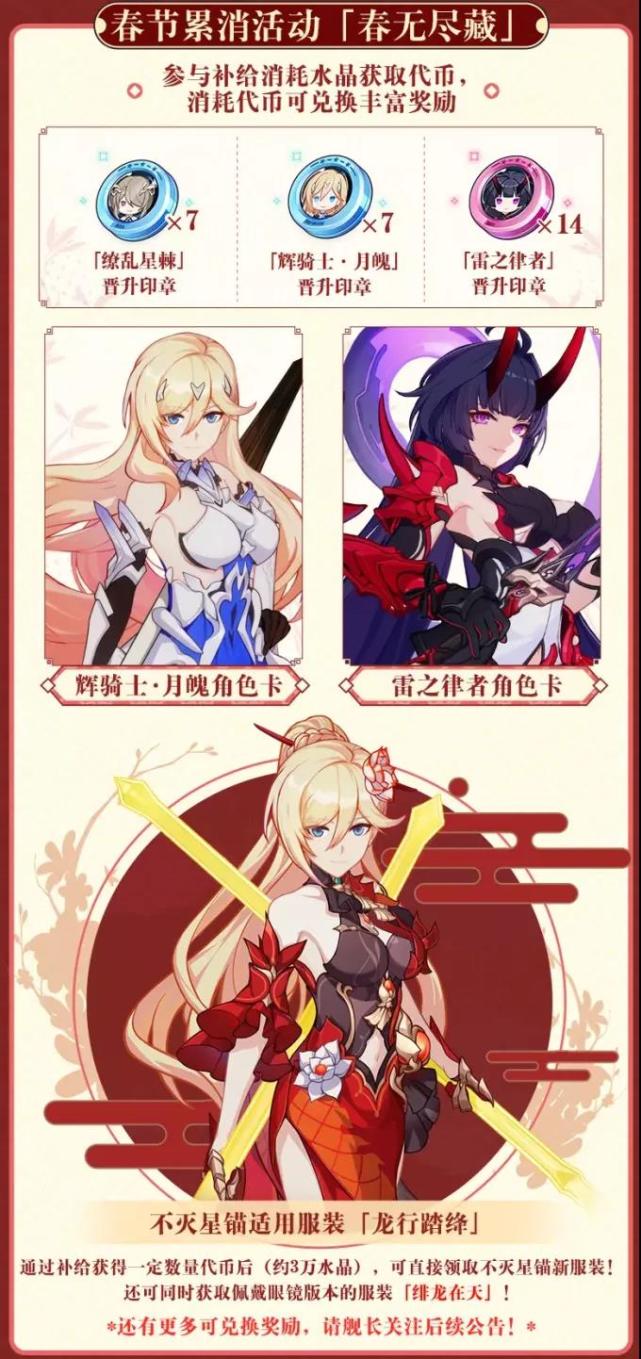 累消活动:可兑换雷之律者、辉骑士·月魄的角色卡或晋升印章以及缭乱星棘晋升印章,和不灭星锚新服装——龙行踏绛。