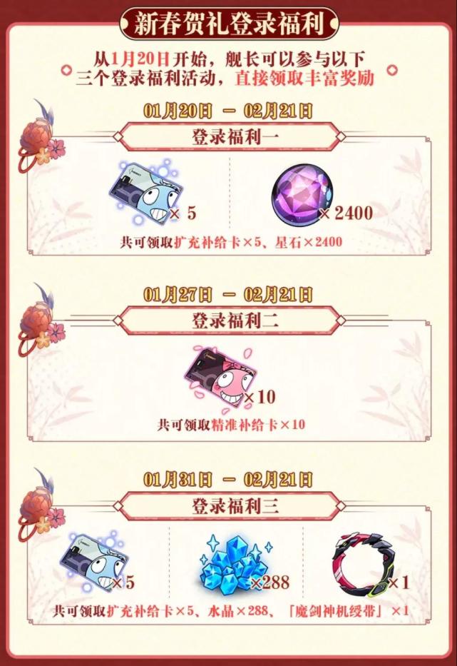 其他福利:登录送精准补给卡于扩充补给卡各10张,以及【拉格纳】自选箱一个外加水晶奖励等。