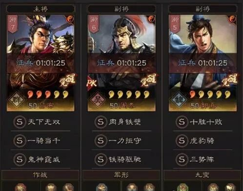 带周泰的三势吕,这个虽然游戏中有玩家在用,不过还是比较少见的,主要还是以带黄月英碰瓷的玩法为主,毕竟抽到周泰的玩家,基本上都能组出虎臣弓或者吴骑了,因为这队玩的比较少,所以不多做评价。