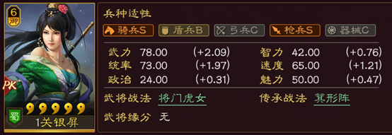 巾帼经试验,目前是跟兵种适性一起算的,关银屏S枪120%的兵种属性,会多15%巾帼的增益,加法累计,等于是适性这一步,属性会乘135%。