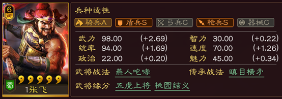 可以看到,满红关银屏跟满红张飞只差17点武力,几乎无差了(因为少50点属性,所以白板会多隔约10点),要知道关妹的武力成长只有2.09,而张飞的有2.69,初始武力张飞更是高关妹20点,这里等于是直接把关妹的武力成长加了0.6拉平。这就等于是带着张飞的武力,去用关妹的战法(含增伤哟),就很imba,而其他属性也都有不小增幅,贴图类比意会一下。