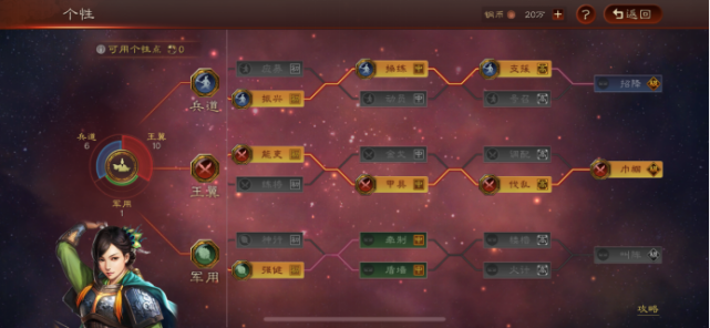 先上我自己的最终加点~因为最终我们需要点出巾帼,所以副个性只能在兵道、军用里抉择,而兵道的中级、高级个性,都是比较利于交战的,尤其是兵道-支援,这个可以减少征兵铜币消耗的个性,非常吸引人,这赛季我比较肝一点,因此选择兵道。
