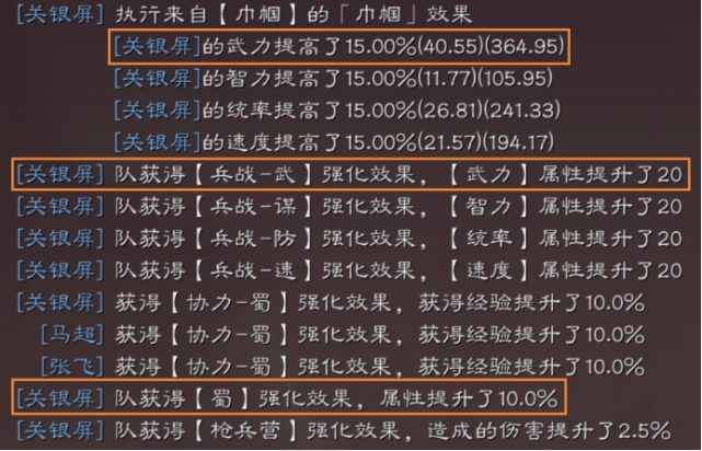 下图可以看到受到蜀阵营强化之前,等于是多了近100点属性点。我们主要看关银屏的武力属性。满红关银屏,武力(364.95+20)*1.1=423。
