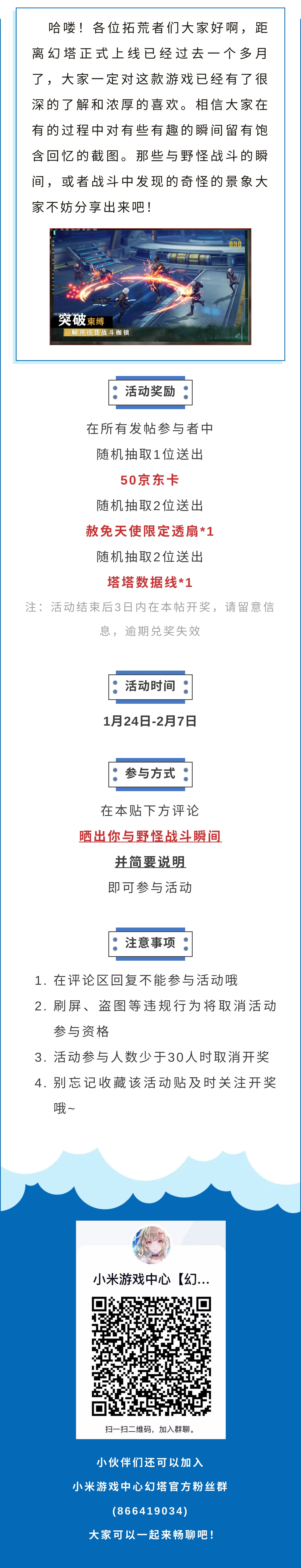 请获奖的玩家于一周内添加小米游戏中心社区活动发奖群:141841827,进群后自助填写群内公告置顶项——活动中奖登记表,逾期(兑奖登记截止日期:2月16日)视为放弃奖励,注意填写时不要漏项哦~ 没有中奖的小伙伴们也不要灰心,持续关注小管家,活动多多,奖品多多,惊喜多多!