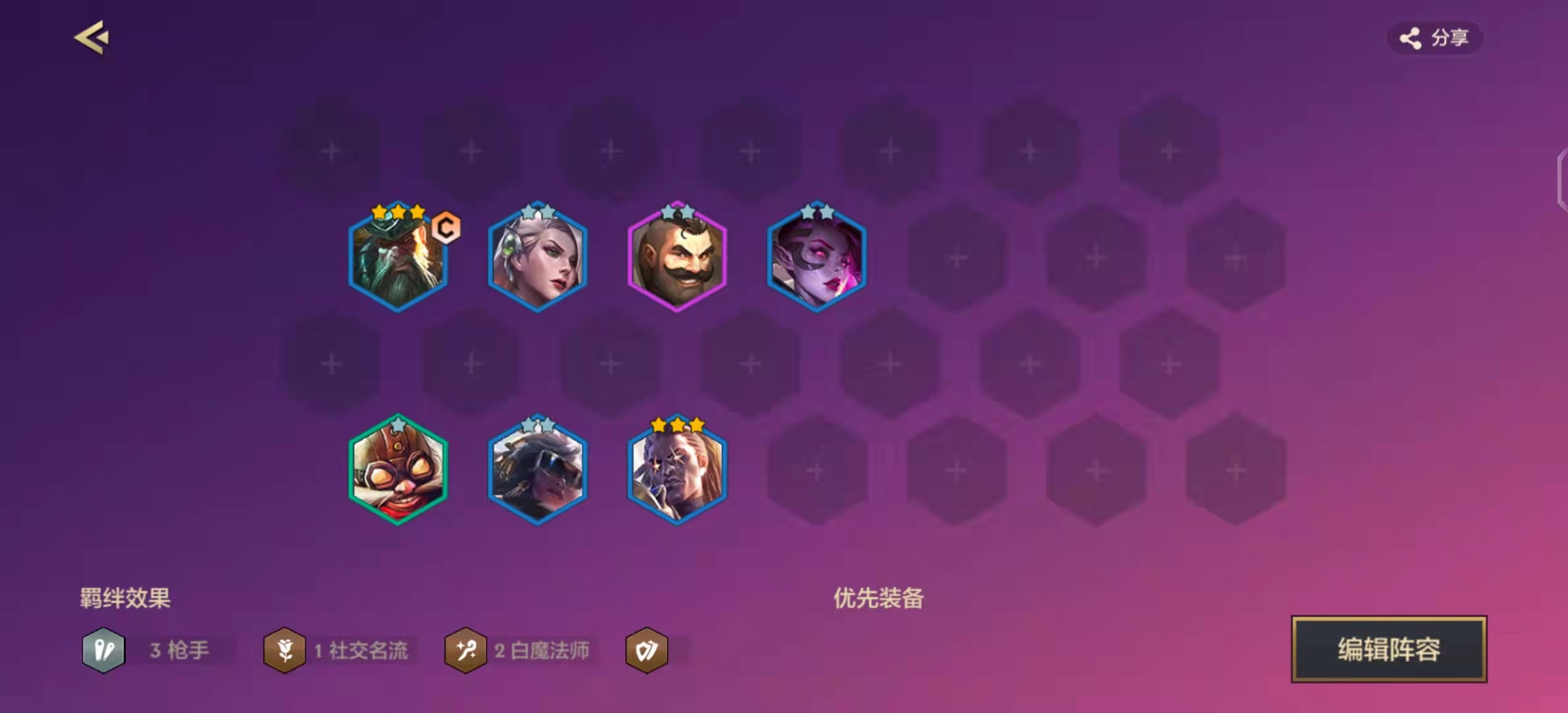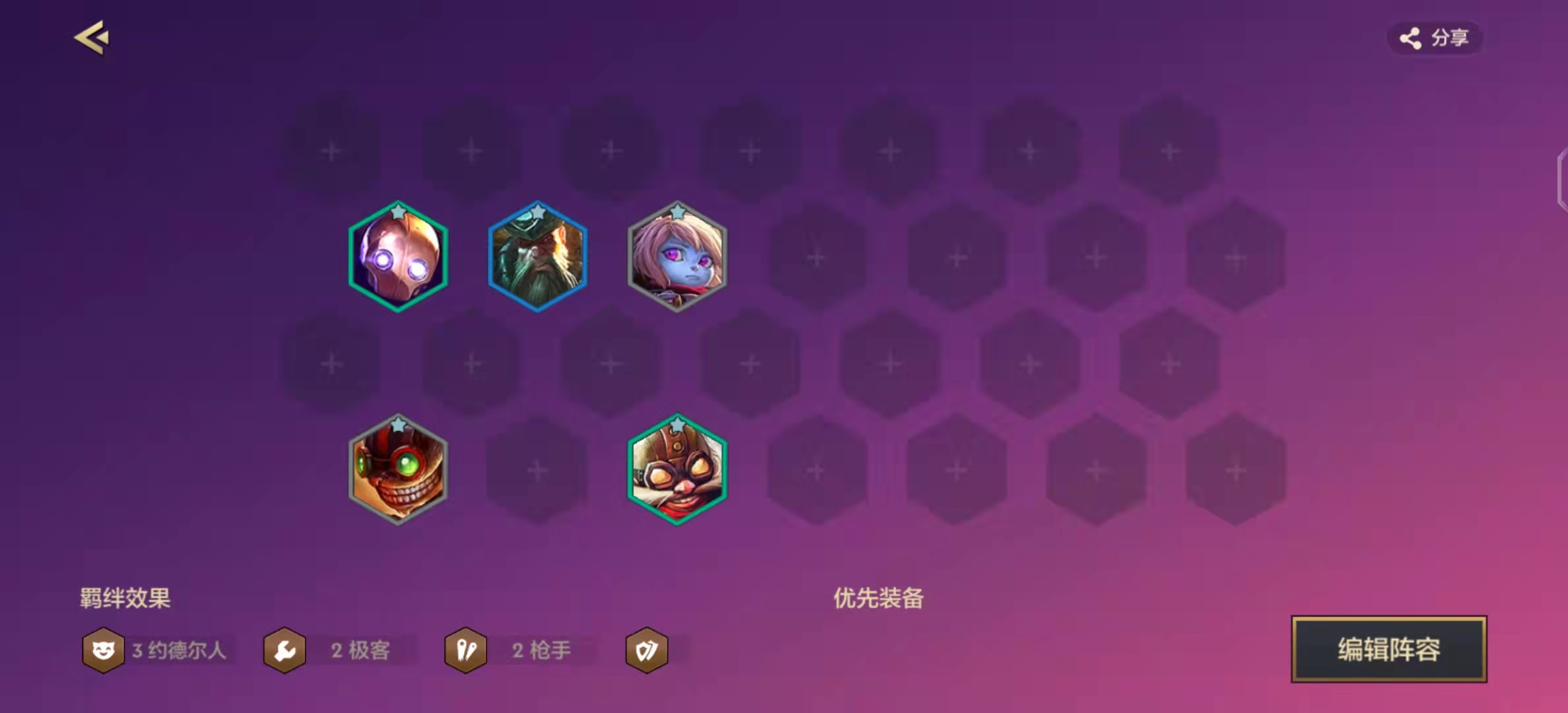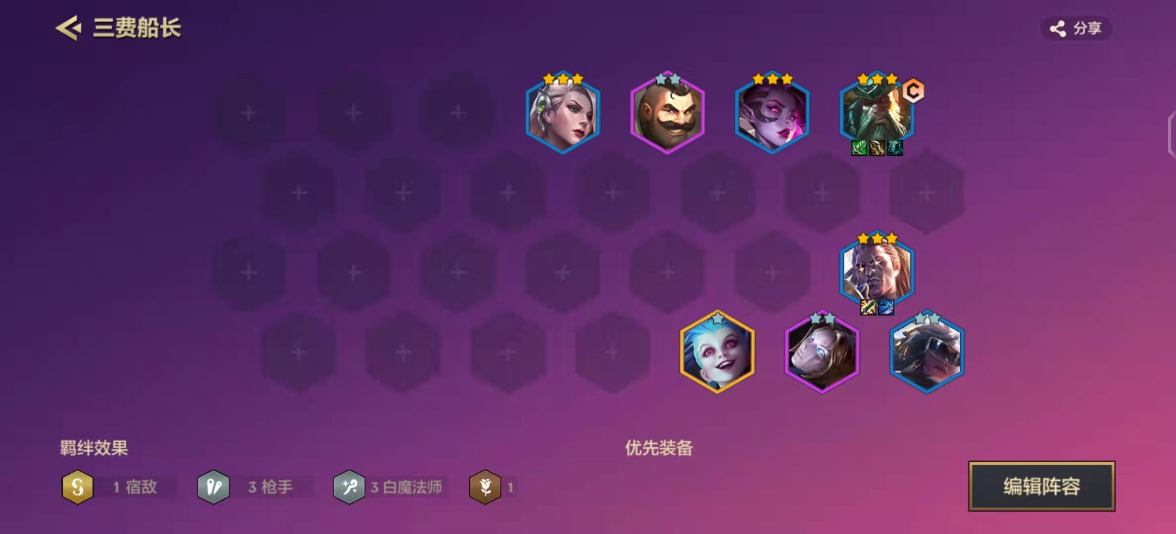 女坦或莫甘娜带肉装都可以,数量多跟双C一起追3。理论上谁三谁给装备,女坦坦度高,莫甘娜的话还有一手控制。