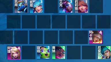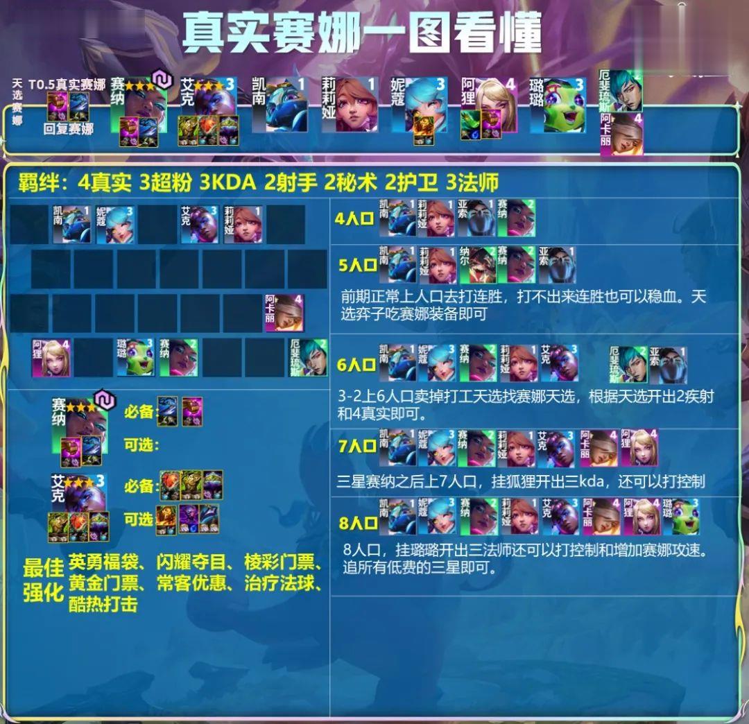 3-2升6人口,在一定赛娜基础上找赛纳天选快速三星。6人口赛娜,凯南,妮蔻,莉莉娅,艾克组成阵容核心,根据天选补厄斐琉斯和亚索凑出4真实2疾射羁绊即可。