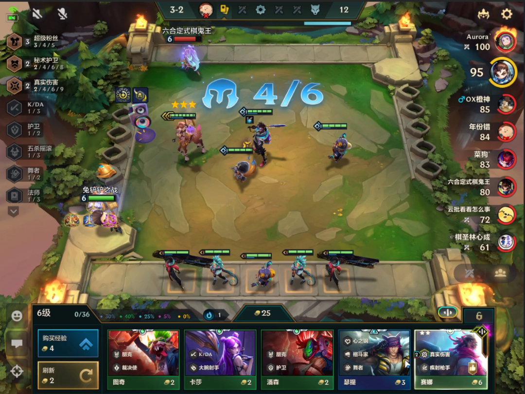 3-2升6人口,卖掉打工天选找赛娜卡特,根据天选补充厄斐琉斯或亚索开出4真实2射手即可。