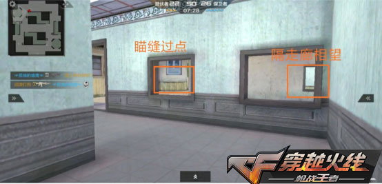 其次就是房间门内侧阴点,这个位置对于从侧门进来的敌人侧身有很好的打击效果,敌方过中房都是直接从窗口跳出而忽略中路的门,并且这个位置还能瞄缝看见进靠我方的中房路口,提前拉枪瞄缝打。