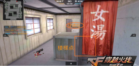 过道再往两边走就是左右房间了,房间里的一号位就是楼梯口,半蹲后利用箱子和楼梯栅栏,还有门的掩护对敌方边路进行穿透射击,由于位处高点,爆头率也是非常高的,敌人看你的位置露的身位非常小,而你在这个点提前穿射,对方的无敌时间基本结束。