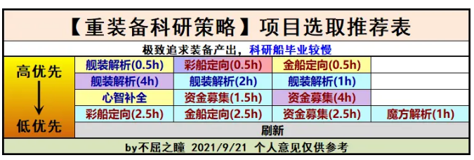 对于偏向中后期的玩家来说,每期科研不投入魔方的情况下按照这样的优先级从上往下,从左到右选择即可。