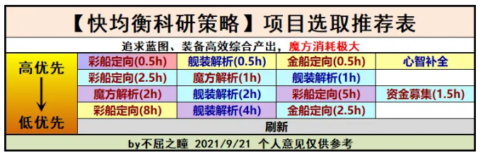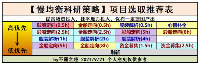 比如:是要快速满破彩船,就优先做短时间科研疯狂刷新彩船D2.5来拉高期望。