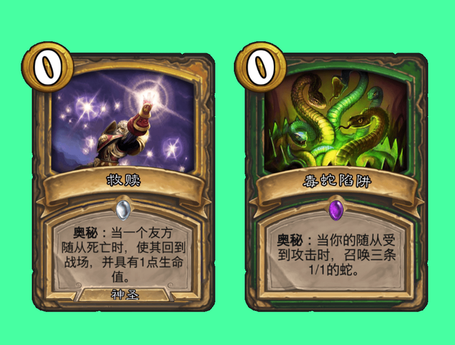 当然和提克特斯的无限冰箱相比,奥秘哥的套路稳定性就要差很多了,因为随机发现奥秘不可控,很难保证每次都有救赎,最蛋疼的奥秘就是毒蛇陷阱了,不仅没什么用,而且在右边生成会占格子,眼镜蛇陷阱好歹还是个剧毒。另外奥秘哥也很怕狂战风怒这样的多频率随从,他们会破坏鹦鹉救赎的循环,或者直接打死小伙伴。