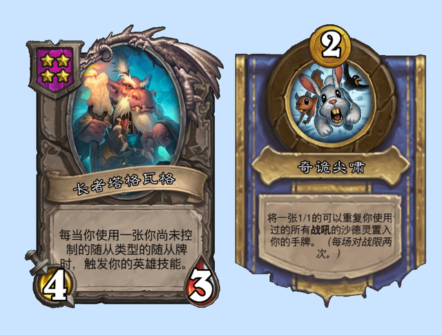 而且按道理说,长者塔格瓦格在其他英雄手里也能产生神奇的效果,比如说古夫,金字塔这样的buff技能肯定是能触发的,天空上尉库拉格的技能招财小猪大概率也是可以被长者塔格瓦格触发的,但是不知道古神恩典这样回合结束时生效的技能是否能够叠加,另外不知道像奥秘哥或者刀油这样的发现型技能能不能触发,运气好实现过的小伙伴可以评论补充一下。
