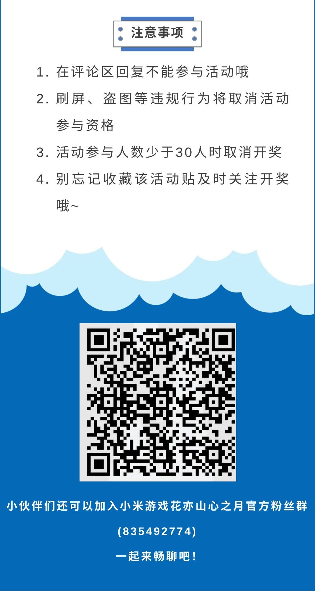 请获奖的玩家于一周内添加小米游戏中心社区活动发奖群:141841827,进群后自助填写群内公告置顶项——活动中奖登记表,逾期(兑奖登记截止日期:2月2日)视为放弃奖励,注意填写时不要漏项哦~ 没有中奖的小伙伴们也不要灰心,持续关注小管家,活动多多,奖品多多,惊喜多多!