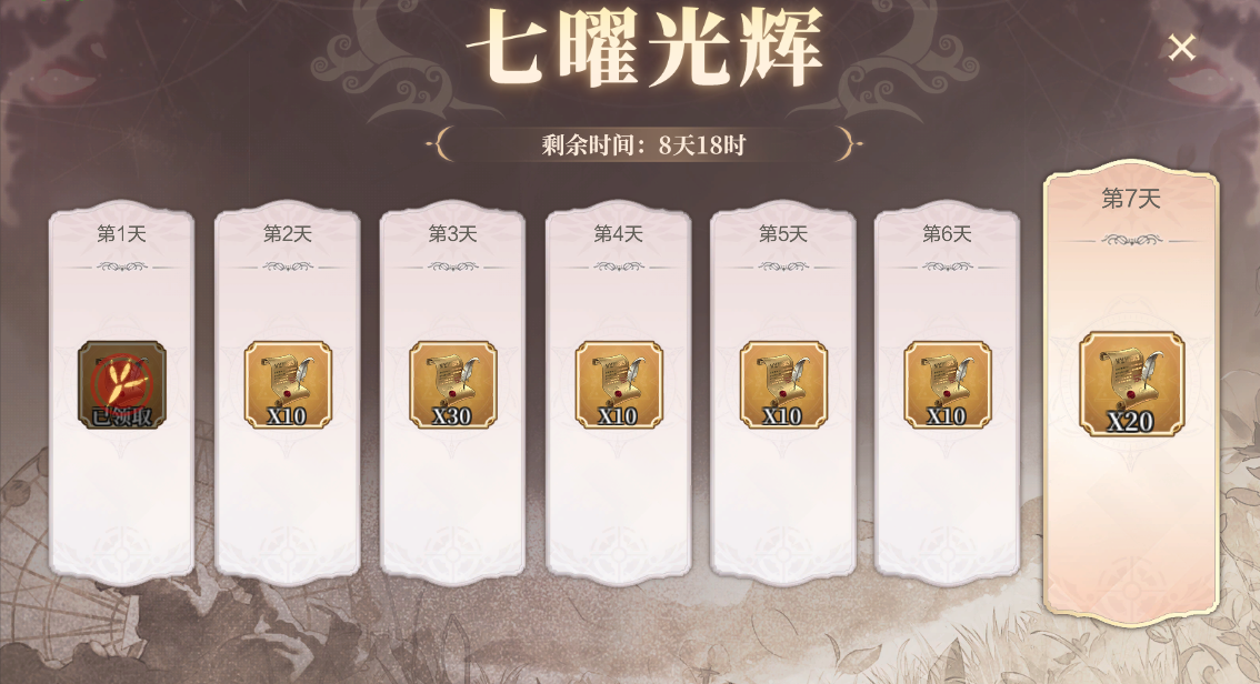 勇者大人每日登陆游戏即可领取多种资源奖励。累计登陆7天可领取全部奖励。