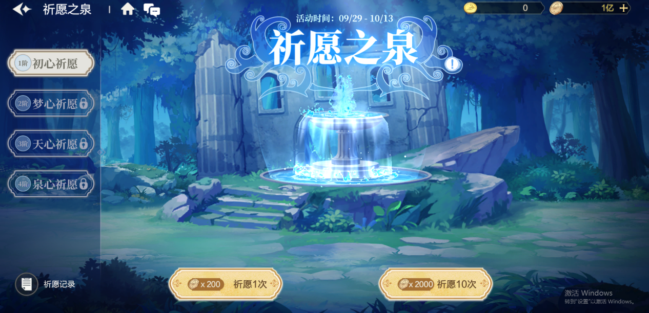 祈愿之泉共有4个阶段,勇者大人首次进入活动时仅开启“初心祈愿”。可使用活动道具【心愿币】进行祈愿奖池的抽取。
