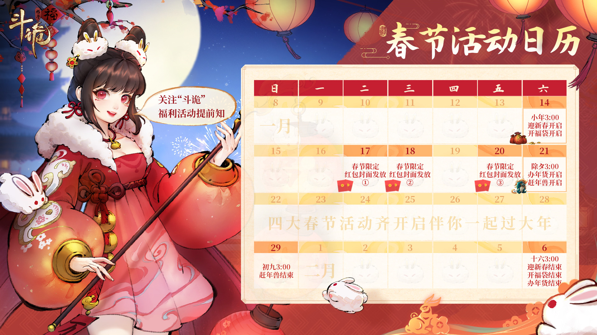 在「新春贺岁资料片·贺新春篇」中,一艘庆典游船将出现在斗诡世界,持续23天。船上举办了各种贺岁活动:迎新春、开福袋、办年货、赶年兽。