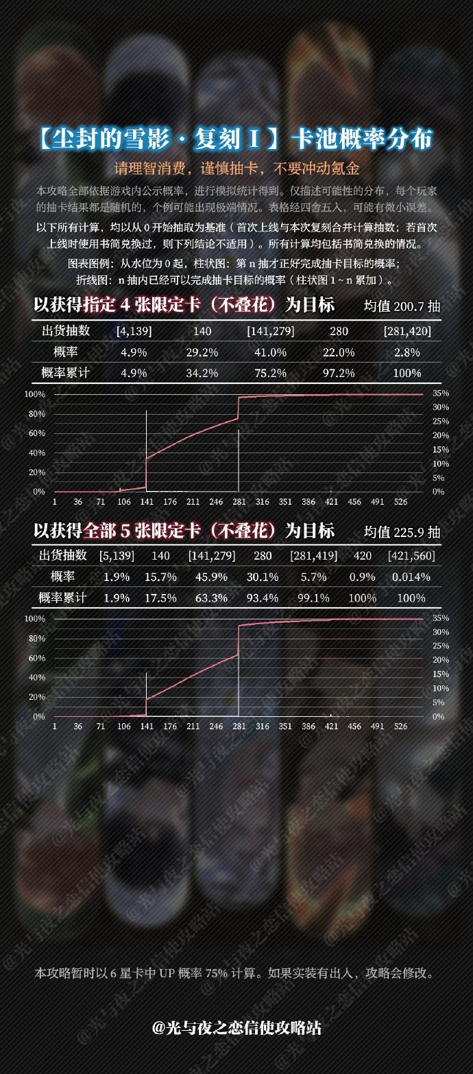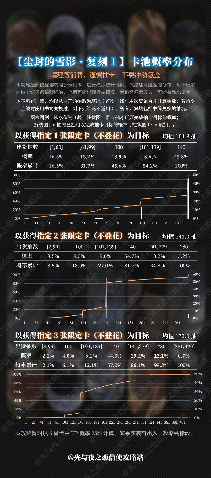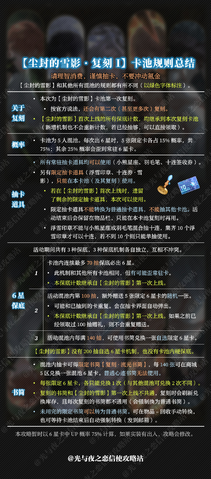 本期为第一次混池复刻,规则与雪影卡池首次上线基本相同(有追加福利,保底和首次上线之间全部继承),和后续其他混池全部不同。除单推仅拿卡的情况外,平均所需抽数都比其他混池要高,请留意。