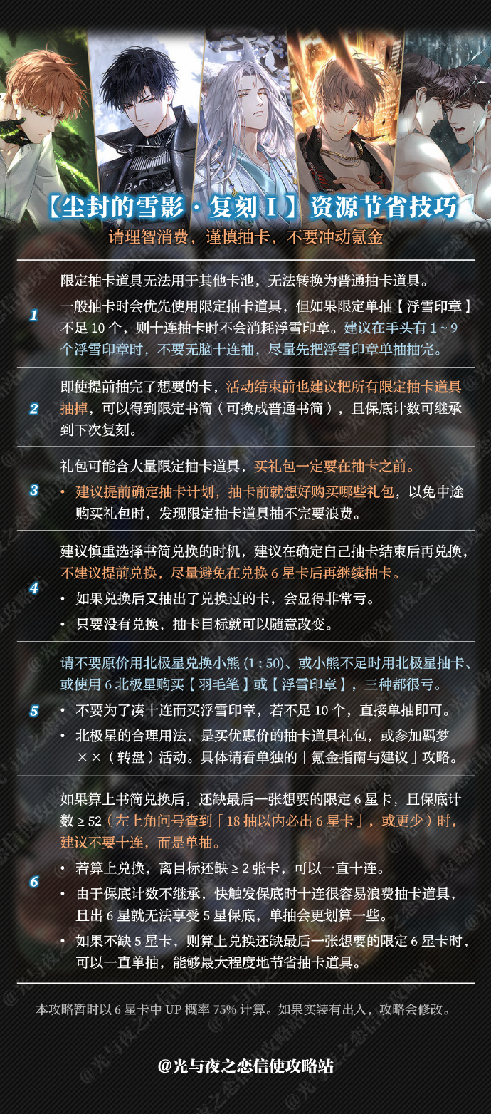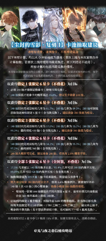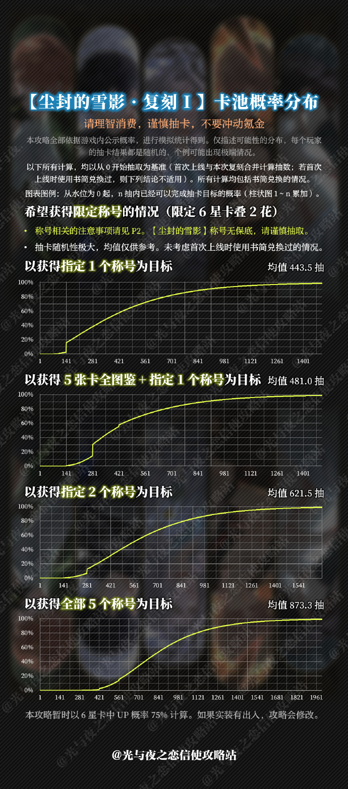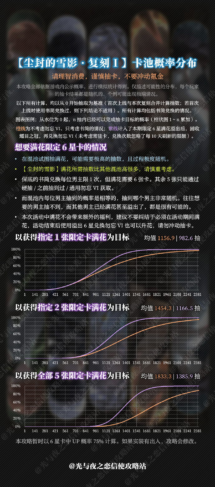 本期为第一次混池复刻,规则与雪影卡池首次上线基本相同(有追加福利,保底和首次上线之间全部继承),和后续其他混池全部不同。除单推仅拿卡的情况外,平均所需抽数都比其他混池要高,请留意。