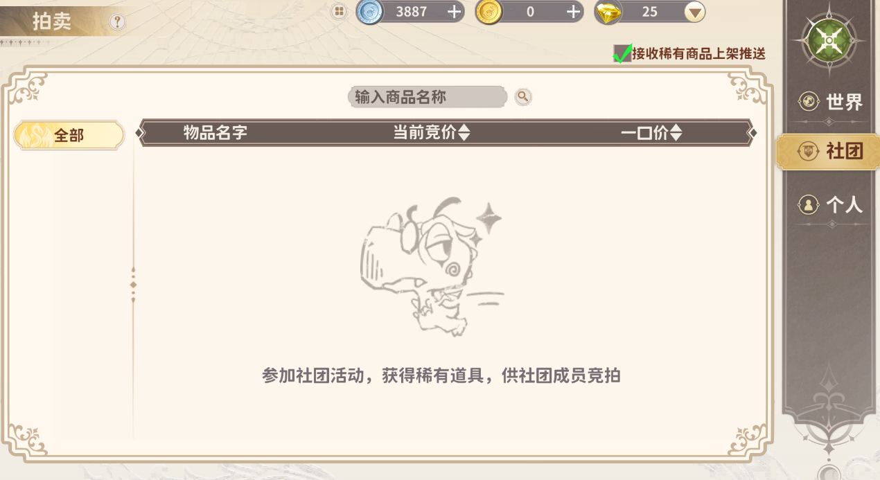 完成社团活动获得社团拍卖道具,社团成员可以优先竞拍。