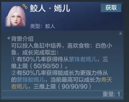 有50%几率获得能成长为更强力侍从的蒙珠鲛嫣儿,当前最高可以成长为寿天者嫣儿,三维上限( 90/90/90 )。